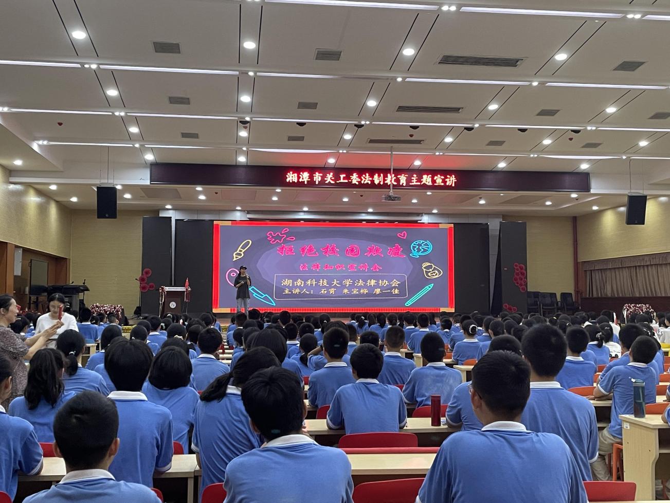 2021年9月,《湖南省法制宣传教育条例》正式施行10周年,为做好宣传贯彻,增强青少年法治观念,2021年9月15日晚,湖南科技大学法律协会再次应邀在湘潭市示范性综合实践基地进行了以“拒绝校园欺凌”为主题的普法宣讲。教育基地的近500余名学生、部分老师参加了此次宣讲活动。