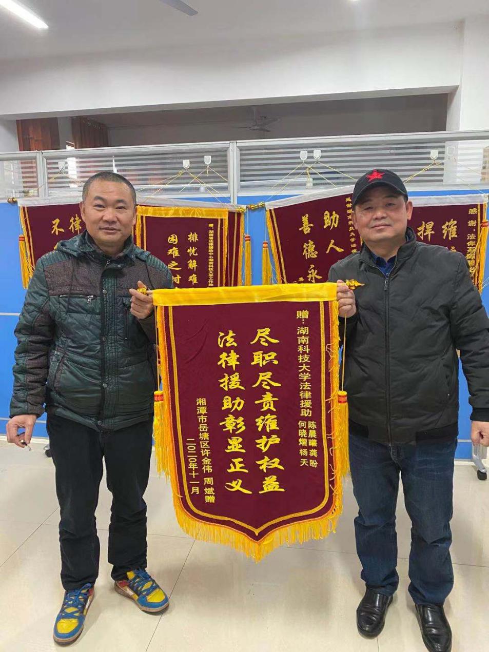 “真心感谢你们,这段时间辛苦你们了!”这是11月30日,周斌等四位受援人将两面分别写有“尽职尽责维护权益,法律援助彰显正义”“法律援助暖人心,赠送锦旗表感谢”的锦旗送到湖南科技大学法律援助中心志愿者手中后说的一席话。