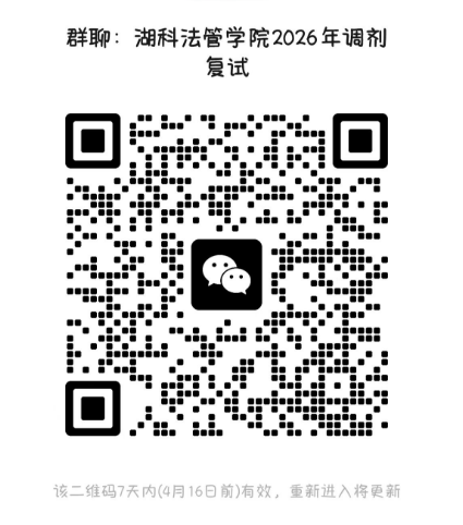 备注:请各位参加一志愿复试的考生加入“2026湖科法管第一批调剂复试群”(见微信码),加群时请备注“考生编号+考生姓名”。