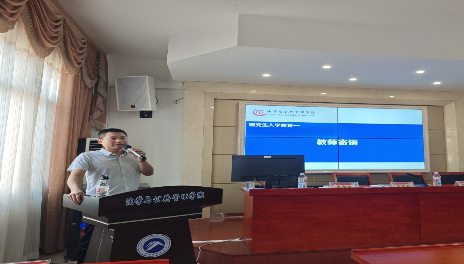 致辞,对2025级新生的到来表示热烈欢迎并提出四点期望:一是“深耕专业”,依托为大家提供的湖南省人大常委会立法研究基地、湖南省检察案例研究基地等多个平台,产出具有影响力的学术成果;二是“以赛促学”,主动投身案例大赛、模拟法庭大赛、创新创业竞赛等,在竞技中磨砺真本领;三是“服务社会”,参与法律援助、社区治理、政策咨询,让“法治”与“善治”在脚下生根;四是“健康成长”,希望大家合理规划时间,协调学业、生活与兴趣。他勉励大家以“研究生”新身份扛起时代担当,在法管360吧