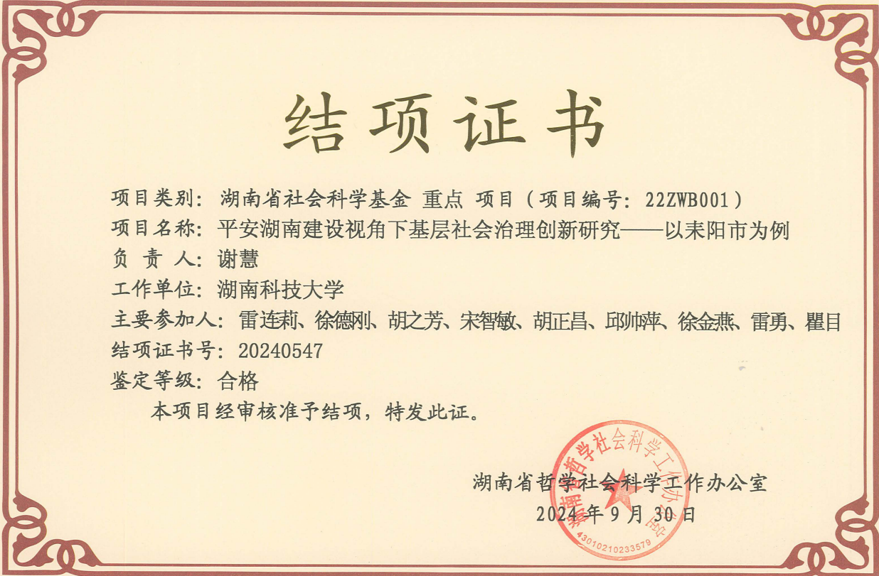 承担的《平安湖南建设视角下湖南基层社会治理创新研究——以耒阳市为例》省社会科学基金智库重点项目成功通过验收,完成结题。该项目由校党委副书记谢慧主持,法管360吧