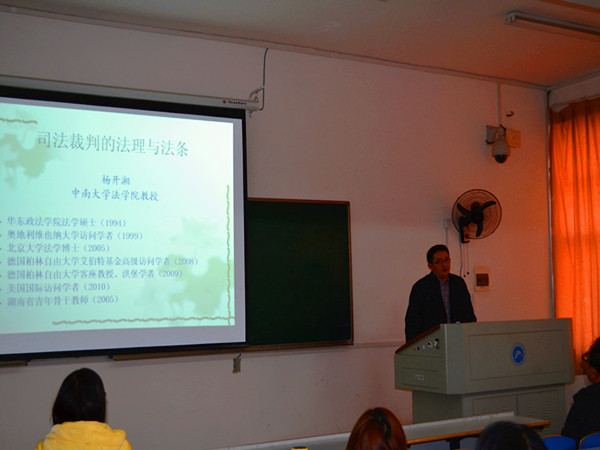 邀请,在九教508教室进行关于“司法制裁的法理与法条”的专题讲座。副院长喻军、法学系系主任刘铁光及吴四江、雷连莉等老师出席,2011级和2012级法学专业学生到场学习。 杨教授以法律与社会的关系为切入点,分别从 “ 法律来源于社会生活 ” 、 “ 社会冲突与司法救济 ” 、 “ 司法裁判的法理与法条 ” 三个大方面进行了阐述,特别是对如何运用法理理解法条以及如何运用法理和法条解决实务问题作了详尽而全面的解读。讲座中杨老师以生动的案例、幽默的语言和严谨的分析赢得阵阵掌声。 最后,喻军老师对本次讲座进行了总结,他高度评价杨老师的讲座,并要求同学们在学习中一方面加强法理知识的学习,另一方面对法条的理解应建立对在法理深入理解的基础上只有将二者有机结合,才能做到对法条的正确运用。 新闻链接: 杨开湘,男,1968年10月出生,湖南溆浦人。华东政法360吧