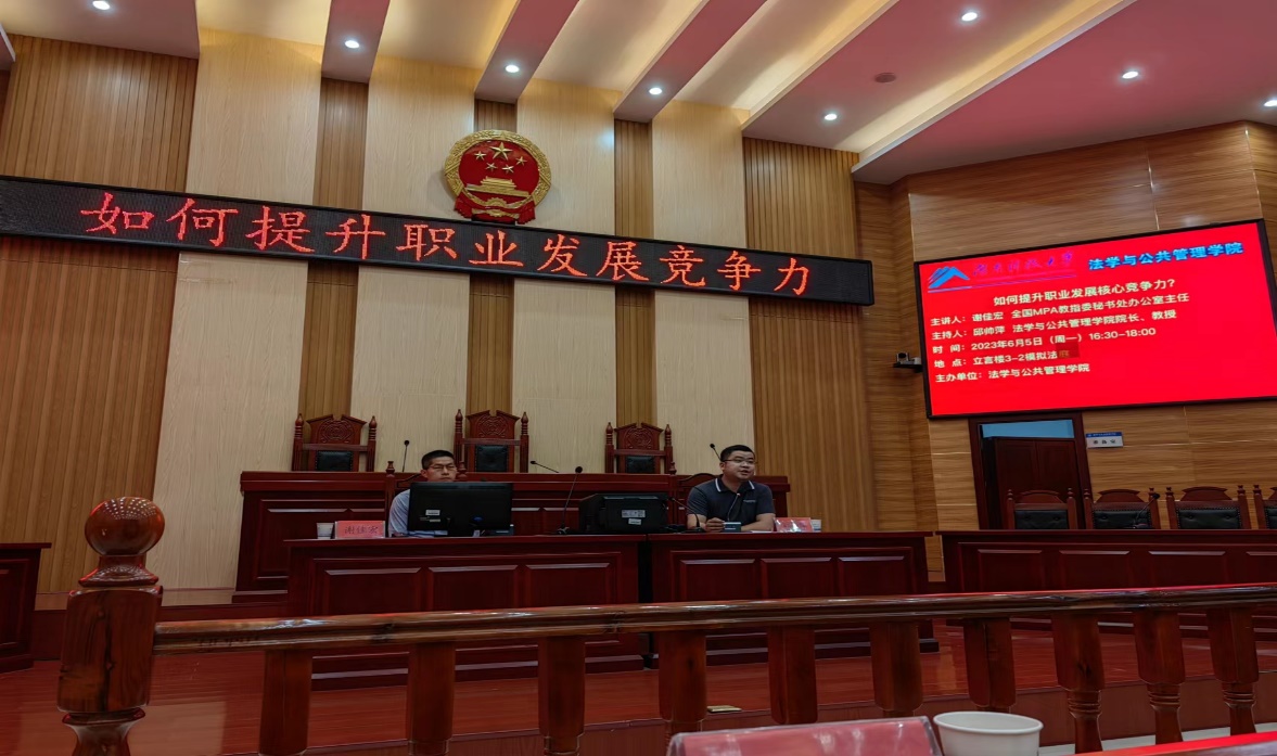 院长邱帅萍主持,21级、22级全体公共事业管理专业、法学专业学生和部分教师参加。谢佳宏主任首先介绍了影响公务员职业发展的影响因素,提出个人潜能开发、成长需要满足和自我价值实现的个人职业成功内在驱动力,影响职业成功的因素主要有心理资本、人力资本、社会资本和组织赞助。其次,谢佳宏主任通过结合我国公务员队伍建设的实际情况,从党和国家对公务员队伍的要求、新时代公务员胜任力模型、结合自身实际的能力提升需求以及案例与访谈等方面,分析了影响公务员职业发展主要能力的相关内容;强调通过专业训练、借鉴京东能力卡片与721能力提升法,以及刻意练习等方式来提高自身职业能力的重要性。最后,谢佳宏主任总结了学历、能力、关系、政绩是影响公务员职业发展的主要因素,其中能力是关键,而政治能力、调查研究、沟通协调、学习能力等是公务员通用能力中的重点,建议学生结合自身实际,明确能力提升的目标和计划,加强理论与实践相结合,在不断学习与实践中提升和超越自我。