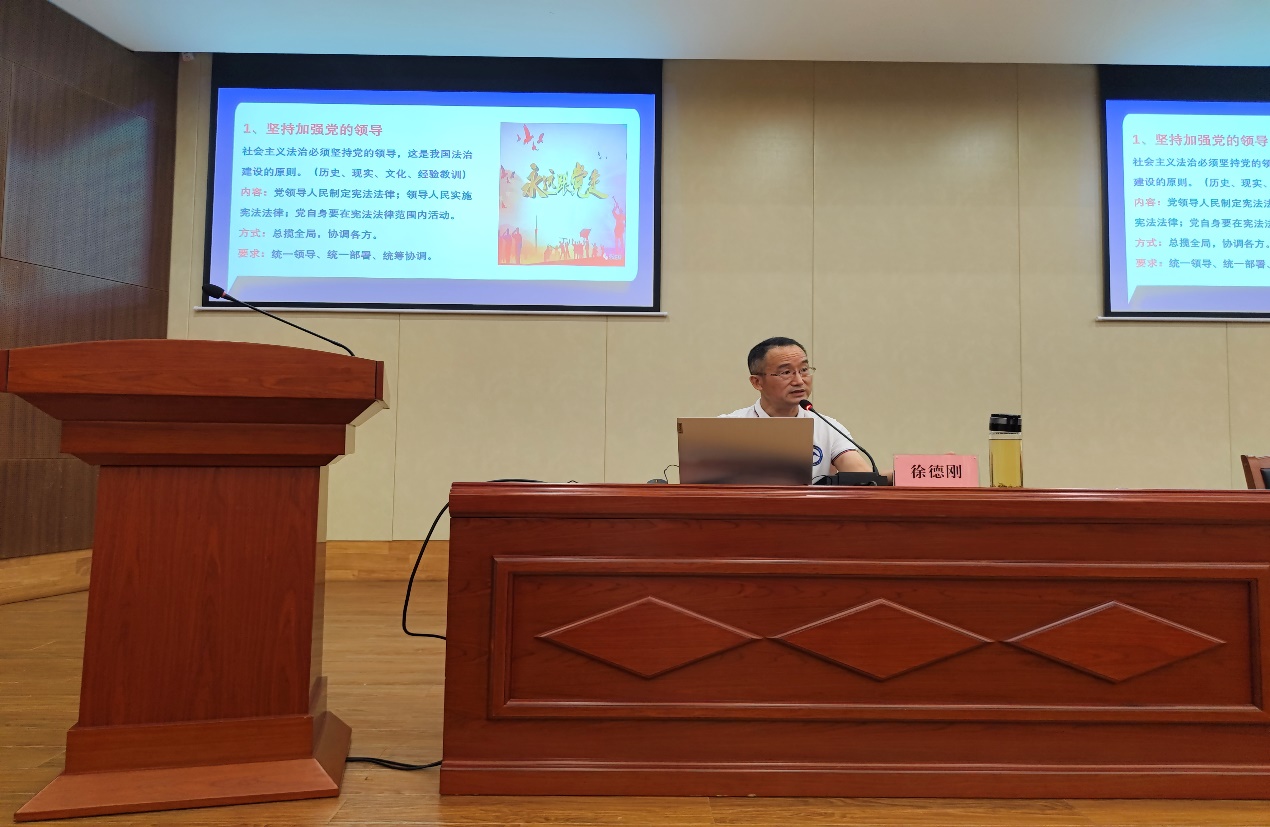 徐德刚教授应邀为培训班相关领导及四十余位学员授课,主讲《习近平法治思想解读》。研究生李立言、本科生邹彤随行参加了宣讲活动。