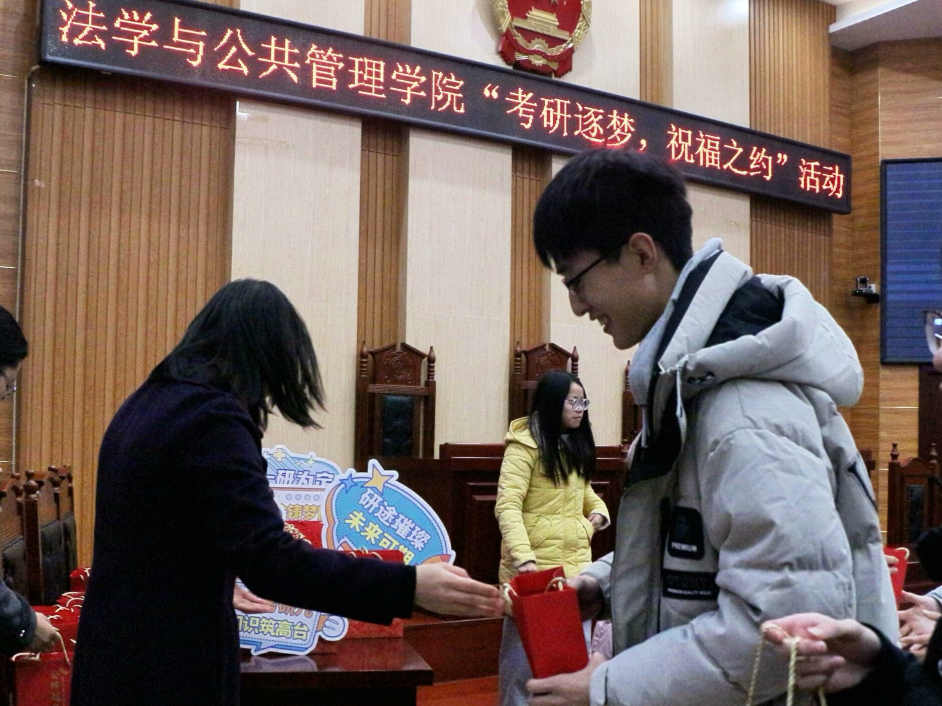 党委副书记范军豪、学工办主任郭志军、21级法学二班班主任雷连莉到场为考研学子送上祝福。