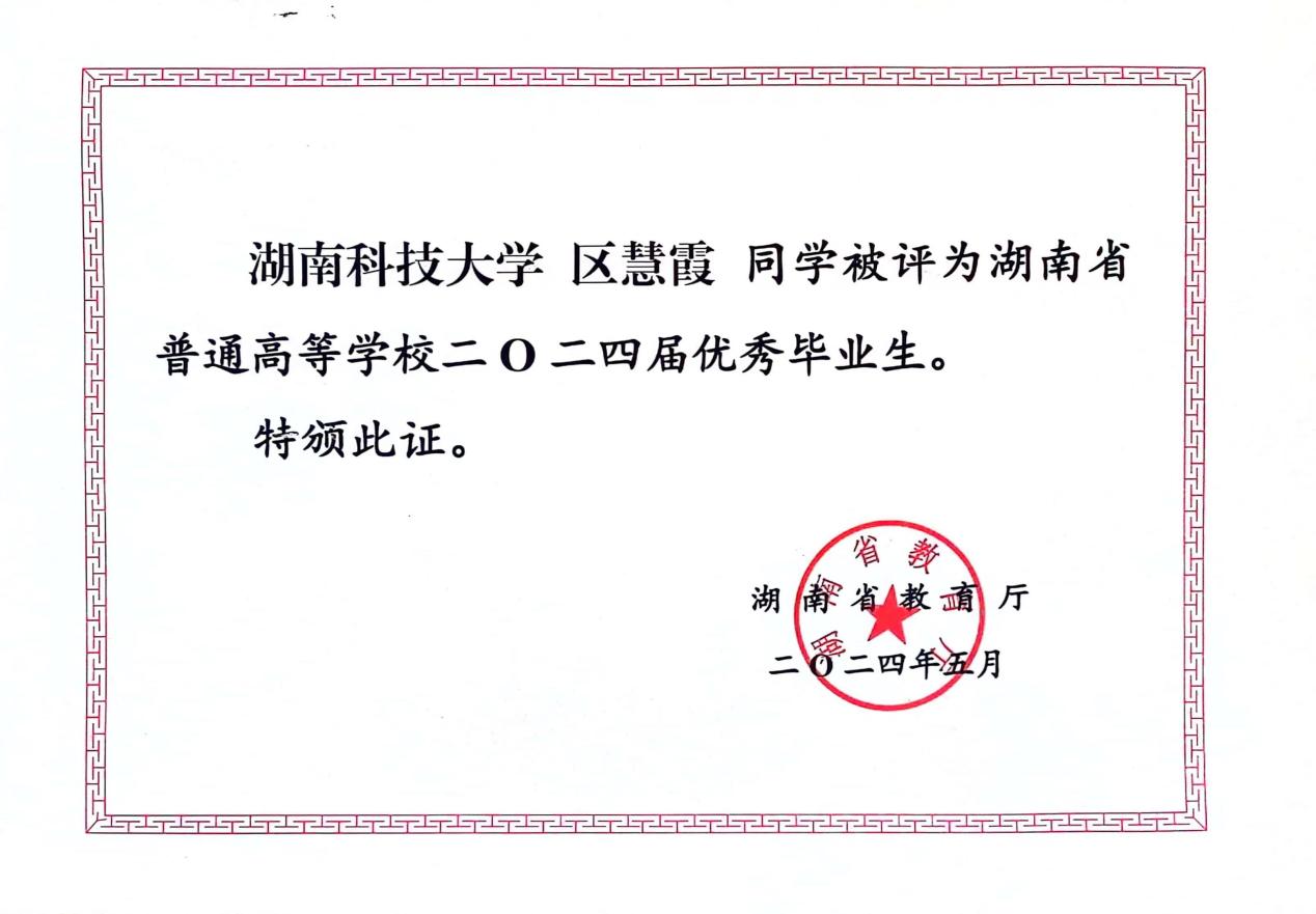 荣誉上,区慧霞获得的奖项不胜枚举,不仅有综合性的奖项——湖南科技大学研究生校长奖,还有专业性的奖项——研究生国家奖学金。这些奖项都体现出学校和社会对她的综合素质和专业能力的肯定。