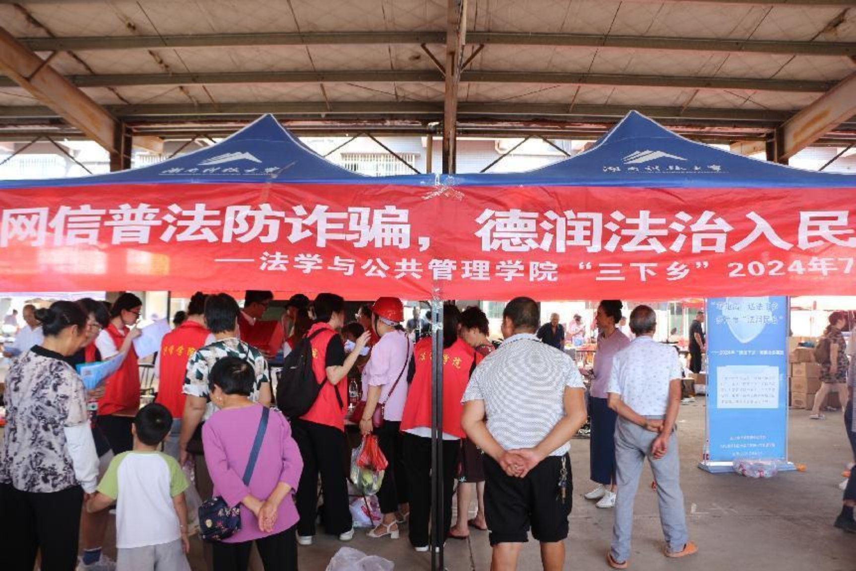 志愿者们一同走进了易俗河镇梅林桥村集市。本次“三下乡”活动联合中共湘潭市委网信办主办,其显著特点即多元化的普法宣传形式,为引导民众学习法律、自觉遵守法律起到了良好督促作用。其中,摆点宣传方式为群众提供了一个了解法律知识的平台,居民们通过法律展板、法律宣传册了解到有关网络安全的法律知识,从法律小游戏中感受到法中蕴含的理和情。