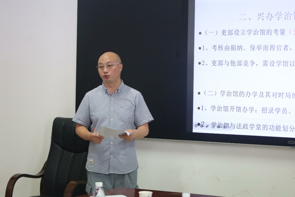活动伊始,刘鄂老师以《清末学治馆法政别科文凭展开的考察》为题,带来了一场极具历史纵深感的学术分享。他以清末学治馆法政别科文凭为独特切入点,通过对历史文献的细致梳理与深入分析,展现了清末法政教育的发展脉络与社会背景,为在场师生打开了一扇了解近代法律教育史的窗口,引发了大家对历史与现实法治关联的深刻思考。
