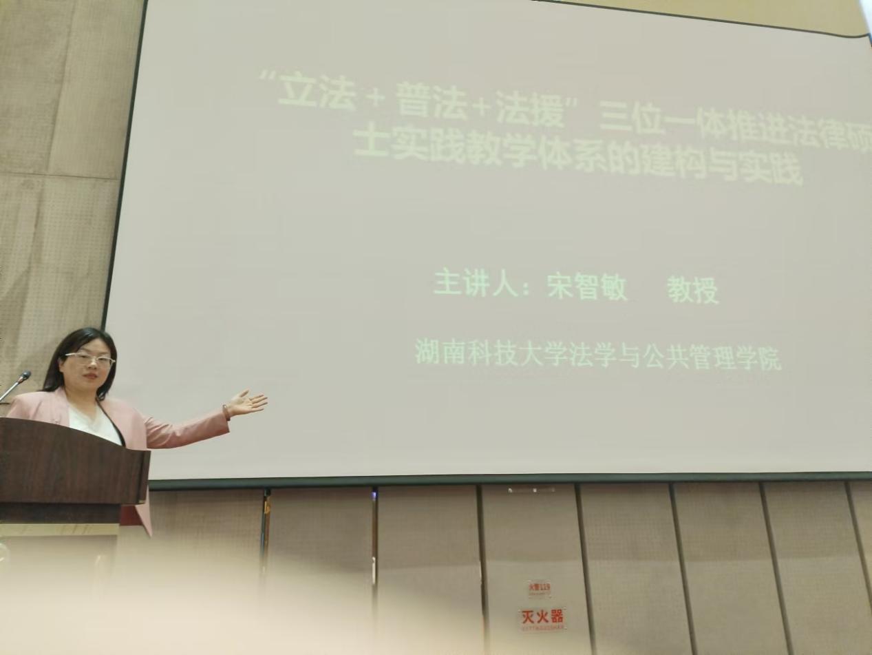 校教育培养机制,推进新时代法律专业研究生教育改革与发展”,旨在大力提升法律专业学位研究生教育教学水平。会上,副院长宋智敏教授做了题为《“立法+普法+法援”一体推进法律硕士实践教学体系的建构》的主旨发言。她认为,法律硕士培养要解决的主要问题有重“知识教育”轻“人格养成”、重“灌输教育”轻“自主创新”、重“理论教学”轻“实践体验”、重“封闭办学”轻“开放培养”。湖南科技大学注重“立法+普法+法援”的法律硕士实践教学体系的建构,并取得了显著的成效:通过立法实践培育了学生的整体法治观;通过法治宣讲(传)培育了学生的社会责任感;通过法律援助培养了学生的公平正义之心。