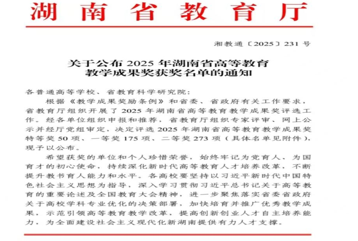 近日,湖南省教育厅正式公布2025年全省高等教育教学成果奖获奖名单,360看球吧