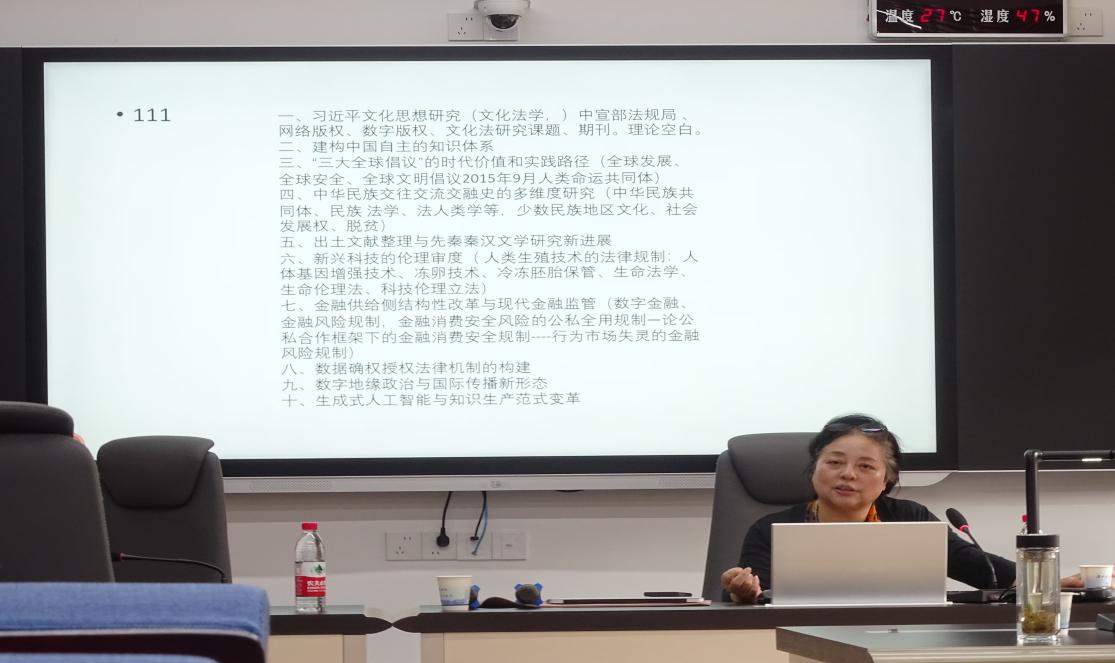 会议伊始,沈丽飞主任围绕学术热点进行发言,指出前沿学术论文大多围绕最新国际热点展开,并就2022-2023十大学术热点进行分享。讲座过程中沈主任强调进行学术选题时应该关注国家社科基金项目相关内容,运用法学思维进行理解。在选题过程中,沈主任建议大家,注重标题相关性,关注当前学术趋势,注重文化法学、文化、社会等相关法学课题。与此同时,鼓励大家在写作过程中,跳出法学学科本身,拓展到其他学科,运用交叉学科思维进行写作。