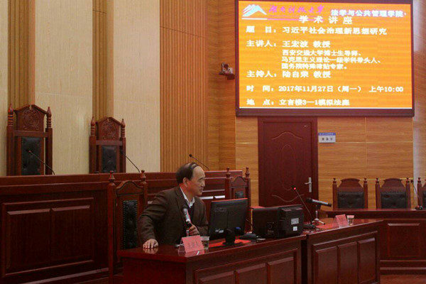 在立言楼3-2模拟法庭举行学术报告会,邀请西安交通大学博士生导师王宏波教授作了题为“习近平社会治理新思想研究”的报告。报告会由副院长陆自荣教授主持,宋智敏、袁玉明、徐金燕、王明、王慧慧、朱宇、罗珊、王球云等360吧