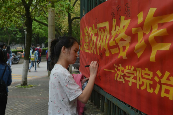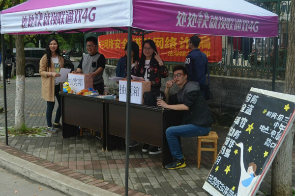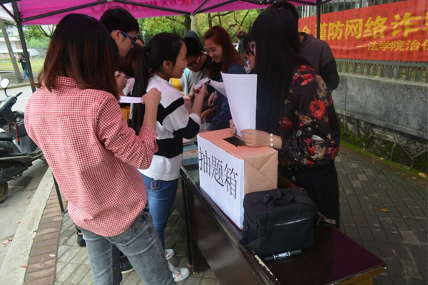 团委学生会治保部在学校北校区电信路口举行了“安全宣传月系列活动之横幅签名有奖竞答”活动。 治保部成员们早早地在活动地点放置了安全宣传海报,吸引过路的同学,一旁的横幅上则印有醒目的安全标语。通过引导同学们阅读安全宣传标语、在横幅标语上签名并请过路同学抽取放在提前准备好的纸箱里的各种有关安全知识的题目并进行解答,以此提高同学们的网络安全防范意识。 来往的同学们热情很高、积极参与。人文360吧