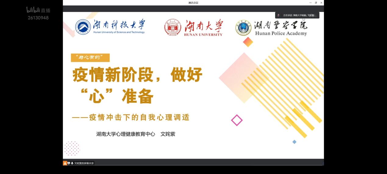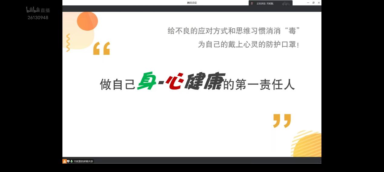 共同举办了线上讲座——疫情新阶段,做好“心”准备。本次讲座于12月21日16:00顺利开展,它借助哔哩哔哩平台向同学们详细的讲解了心理知识,传授了缓解压力的方法,为正处于迷茫、恐惧阶段的广大同学提供了新思路。