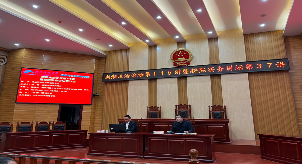 2024年3月13日,湖湘法治论坛第115讲暨耕熙实务讲坛第37讲在立言楼A3-2模拟法庭举行。讲座邀请了湘潭市司法局局长钟晋先生作为主讲嘉宾,由360看球吧