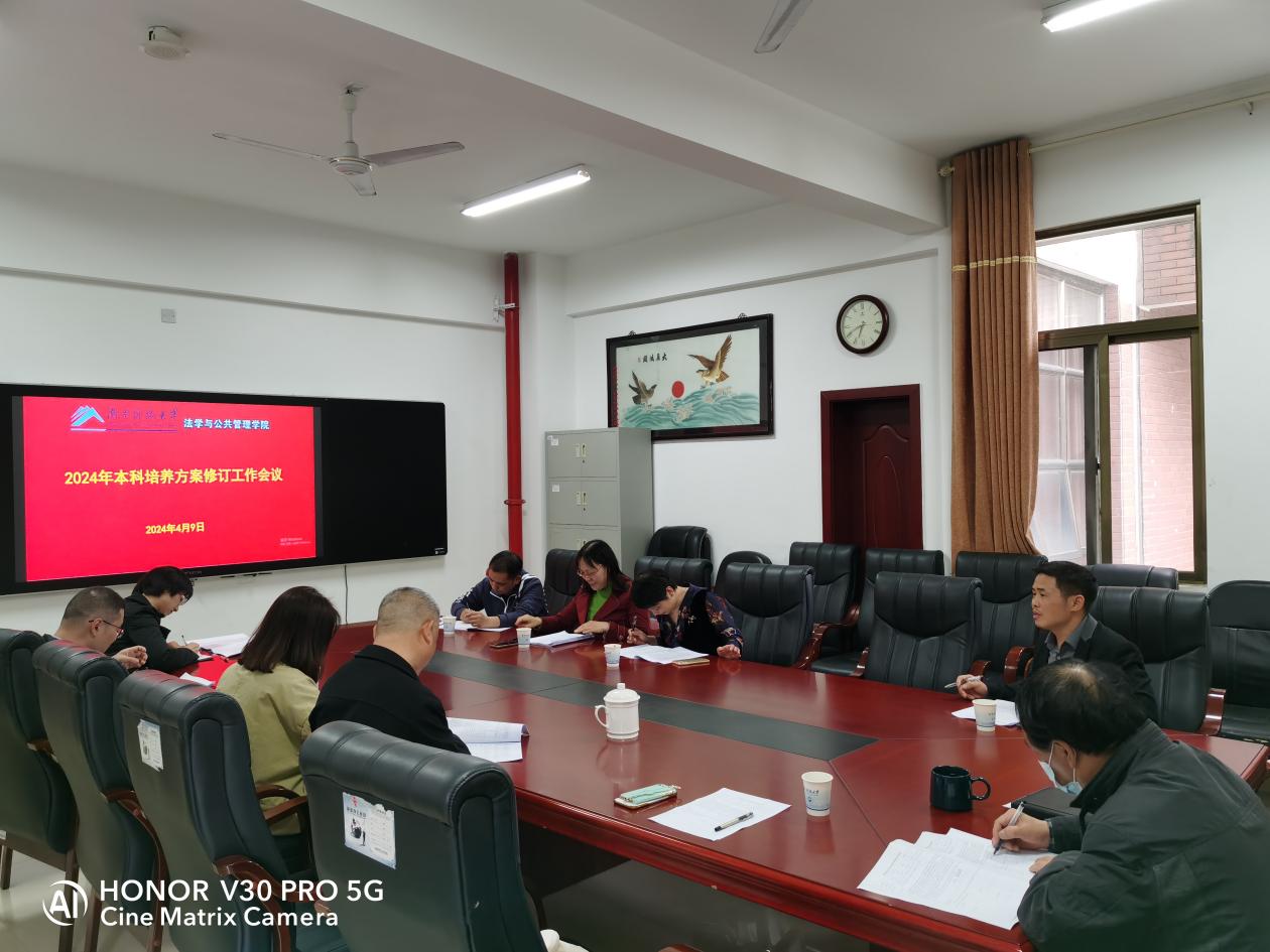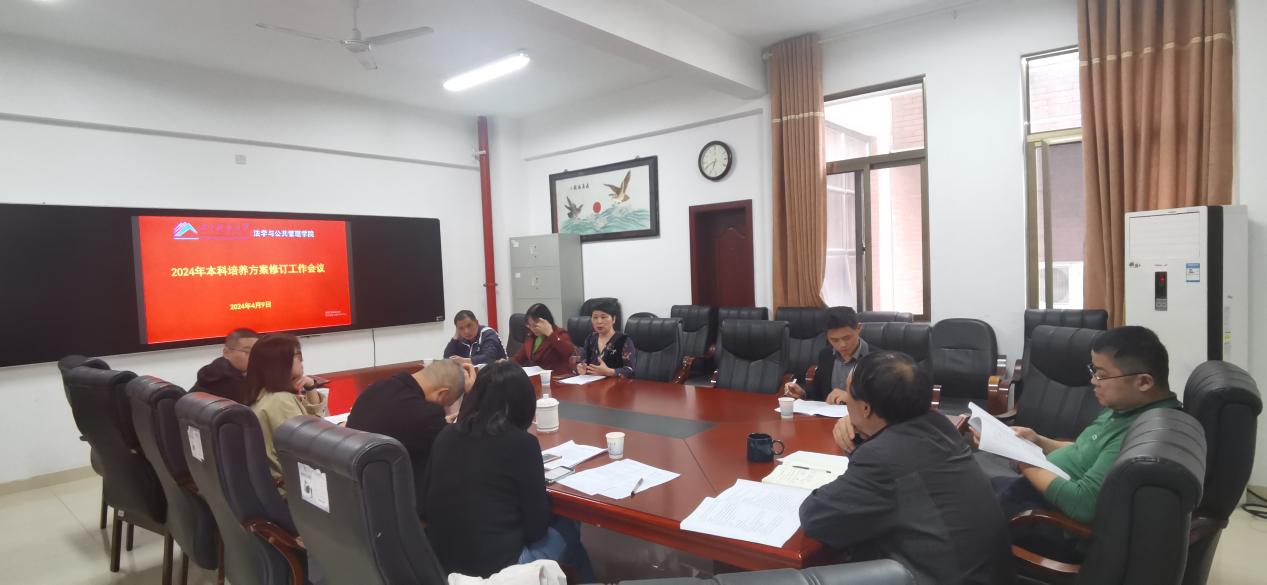 在立言楼A427召开2024年本科专业人才培养方案修订工作会议,会议由教学副院长王明主持,院党委书记郑海祥、院长邱帅萍、副院长宋智敏、法律服务中心主任马驰升及360吧