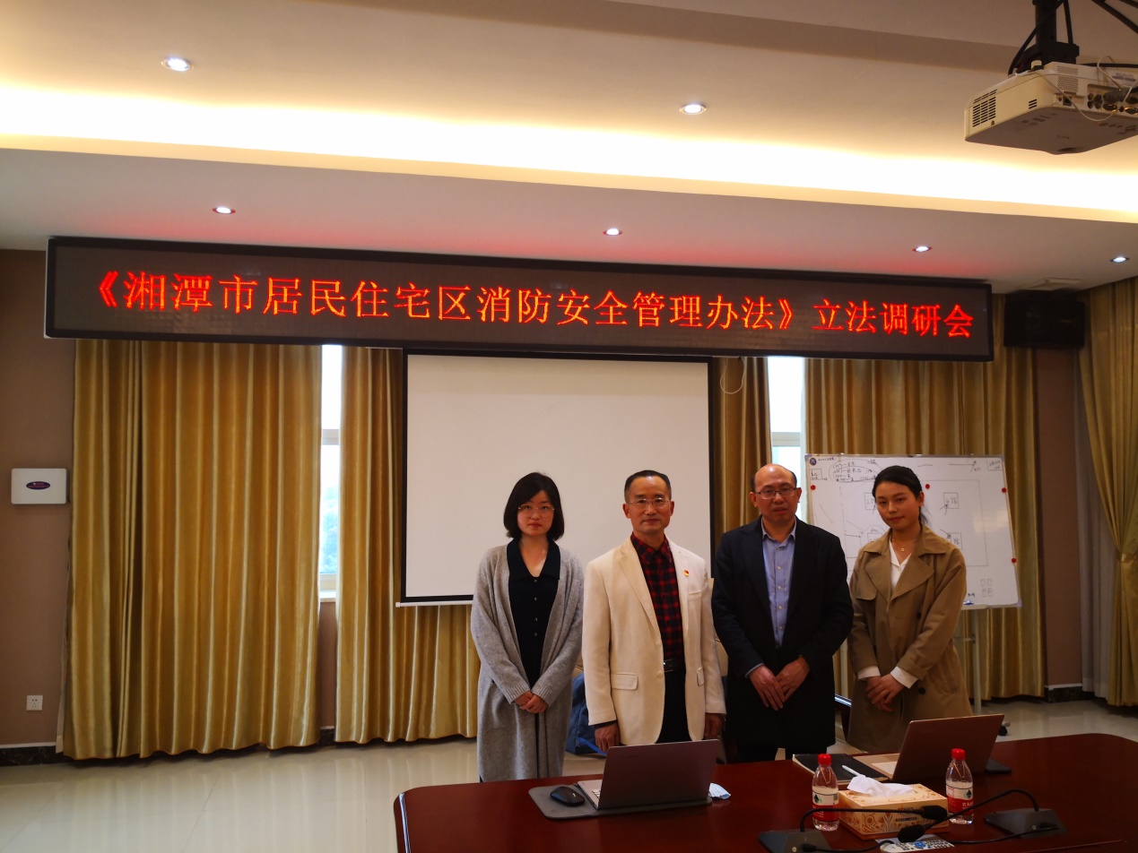 徐德刚院长、李云霖教授带领研究生曾怀莹、郭哲前往湘潭市消防救援支队参加了本次草案调研会,湘潭市人大、市政协、市司法局、市公安局、市应急管理局等相关单位的领导以及来自湘潭市社区、律所、物业服务企业等有关群体的代表出席了本次会议。