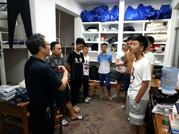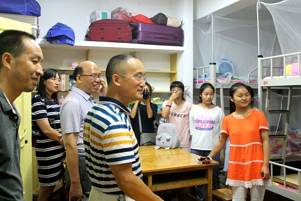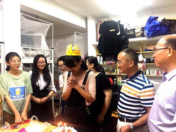团委学生会副主席谭巧俐和宿管部副部胡玲带领前往五区三栋17级女生宿舍,党委书记黄伟、副书记叶军由宿管部副部曾迪娜带领前往六区三栋的17级男生宿舍,逐间看望新同学。 每到一个寝室,徐德刚院长首先询问的就是宿舍里的孩子们分别来自哪里,接着提醒他们在日常生活中要多注意用水用电的安全,防止意外事故发生。“室友间一定要互相帮助,互相包容,珍惜来之不易的四年同宿之情谊。”徐德刚院长深切地对新生们说道。来到五区三栋602时,恰逢17级法二班廖佩文同学过生日,徐院长高兴地为她点燃生日蜡烛并送上美好的祝愿。 见到17级有一名身高191cm的男生,黄伟书记高兴的说:“男生要注意学习与娱乐的时间分配,尽管是文科男生,平时也要多运动。可以组建一个篮球队,一定能取得很好的成绩!” 叶军书记还建议新生要注重培养独立生活的能力,同时强调了宿舍氛围的营造,要互相团结,才能共同进步。 对于领导和老师的到来,新生们反响热烈,一路掌声笑语。17级公管二班的朱端平同学说:“360吧