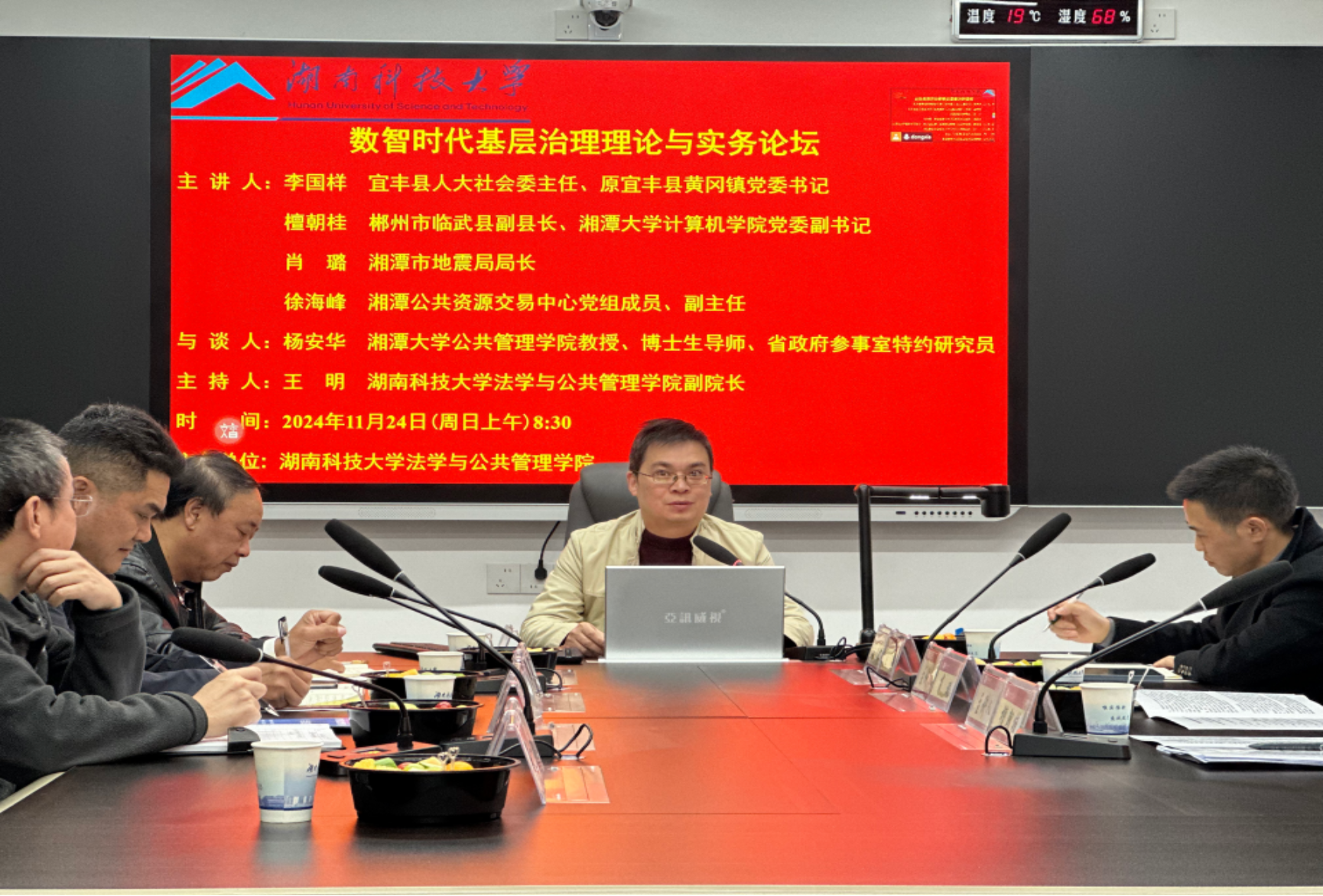 在立言楼A303成功举办了“数智时代基层治理理论与实务”学术论坛。此次论坛邀请了江西省宜丰县人大社会委主任李国样、湖南省临武县副县长(挂职)檀朝桂、湖南省湘潭市地震局局长肖璐、湖南省湘潭市公共资源交易中心副主任徐海峰等人担任主讲嘉宾,湘潭大学公共管理360吧